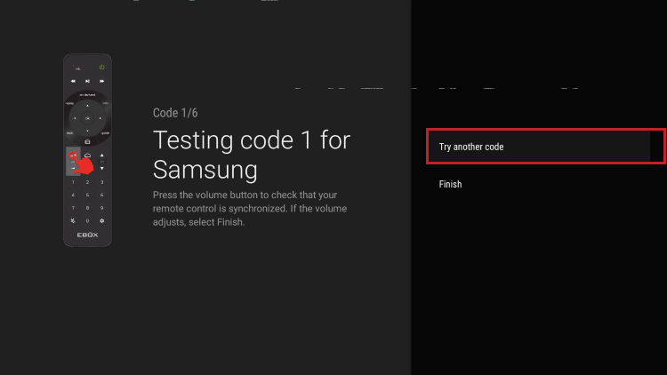 Select your TV manufacturer and test the codes displayed on the screen until you find one that works. To test, try increasing the TV volume with your EBOX remote control. If it doesn’t work, select “Try another code”.