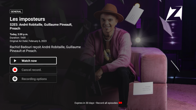 Choose the show you wish to record and press the “OK” button on your remote. Select the “Record” option displayed on the screen and press “OK” again.
