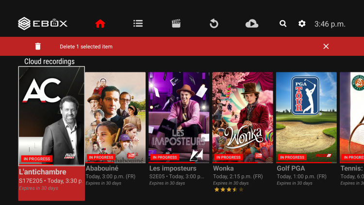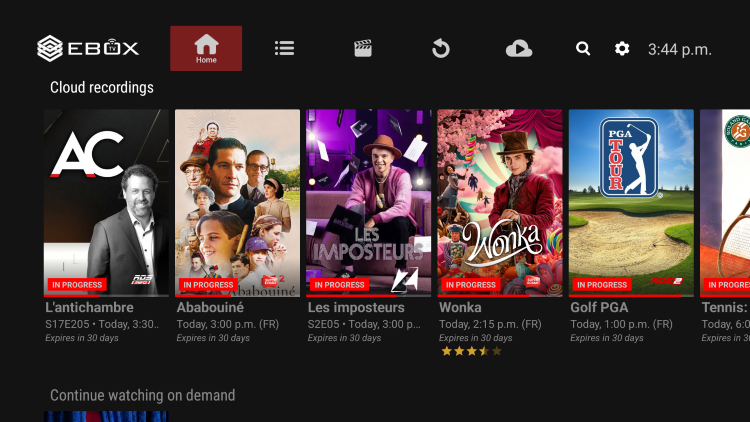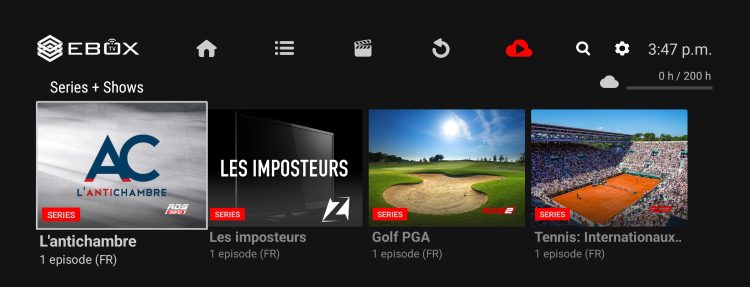 The recordings are displayed in rows, in chronological order from the most recent in the home menu of the EBOX TV app. To access the “Home menu”, press the “EBOX TV” or “BACK” button on your remote and select the desired show.