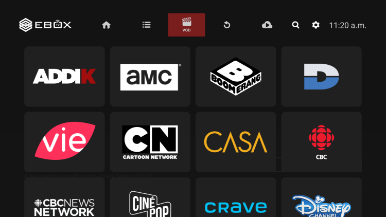 In the EBOX TV app, select the “VOD” (Video On Demand) menu or press the “Video on Demand” button on the remote control.