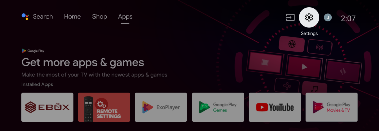 In the EBOX TV app, open the “Settings” menu by selecting the gear icon in the upper right corner.