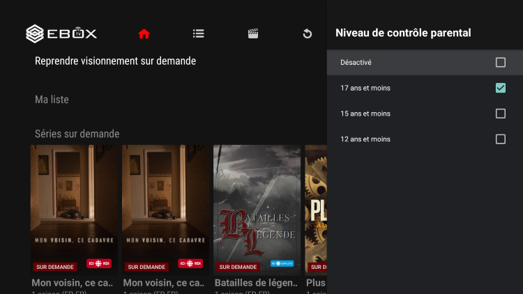 Le contrôle parental permet de bloquer le contenu par tranche d’âge (12, 15 ou 17 ans). C’est aussi dans ce menu que tu peux créer ou modifier ton NIP. Lors de la première configuration, tu seras invité à saisir un nouveau NIP.