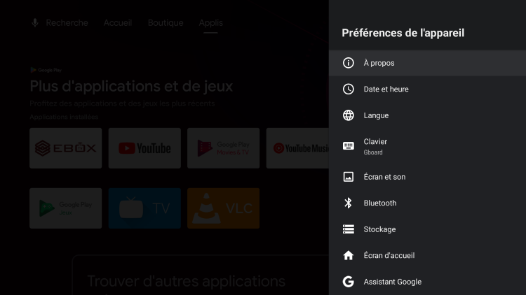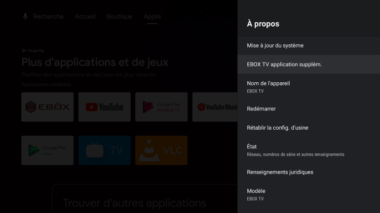Ensuite, sélectionne « À propos » et « EBOX TV application supplém. » (Sur certains modèles « Mise à jour application TV ») et suis les étapes à l’écran.