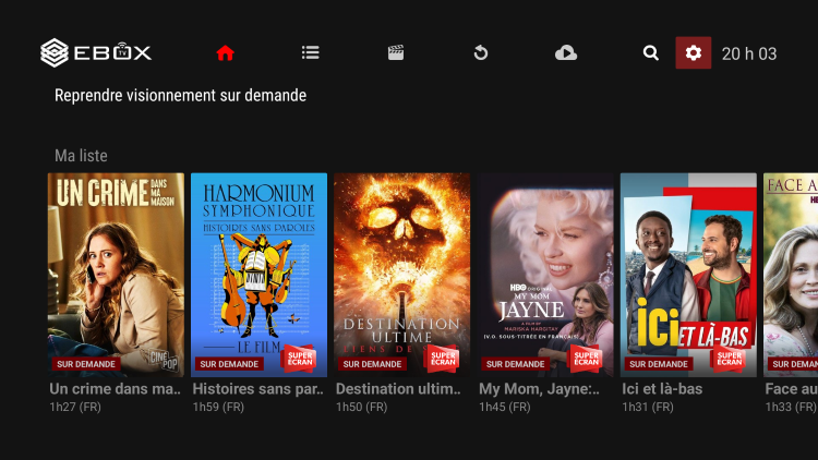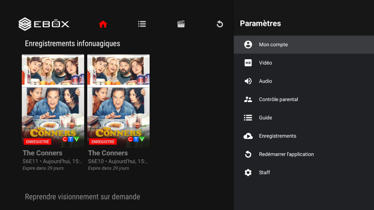 À partir de l’écran d’accueil de l’application EBOX TV, sélectionne le menu « Paramètres » identifié par l‘engrenage en haut à droite.