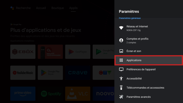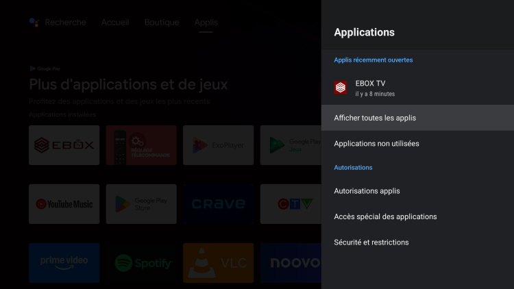 Sous « Applis récemment ouvertes », repère EBOX TV.