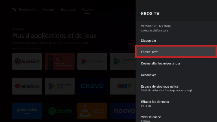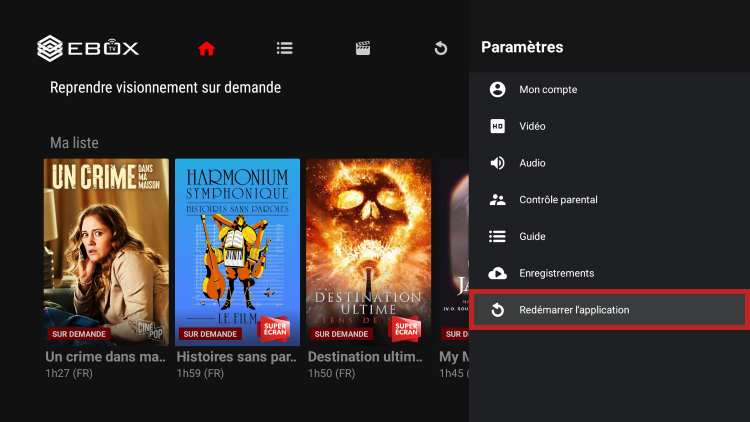 Deux moyens sont mis à ta disposition pour redémarrer l’application EBOX TV.