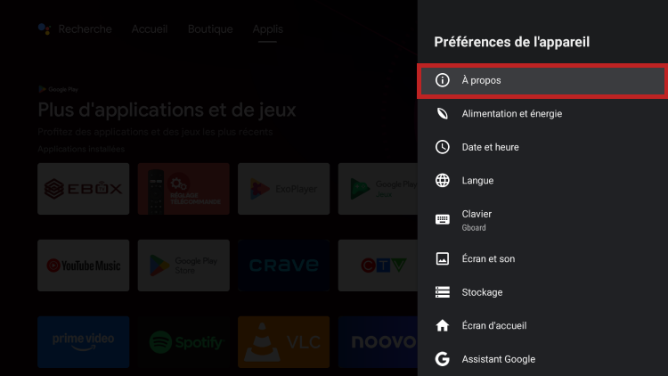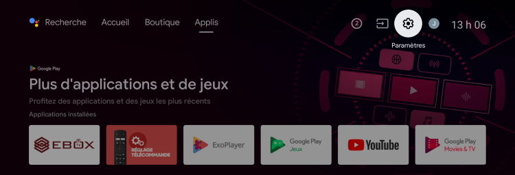 Pour rétablir la configuration d’usine du décodeur EBOX TV 2.0 ou 3.0, sélectionne le menu « Paramètres » représenté par l’engrenage en haut à droite de l’écran d’accueil Android.